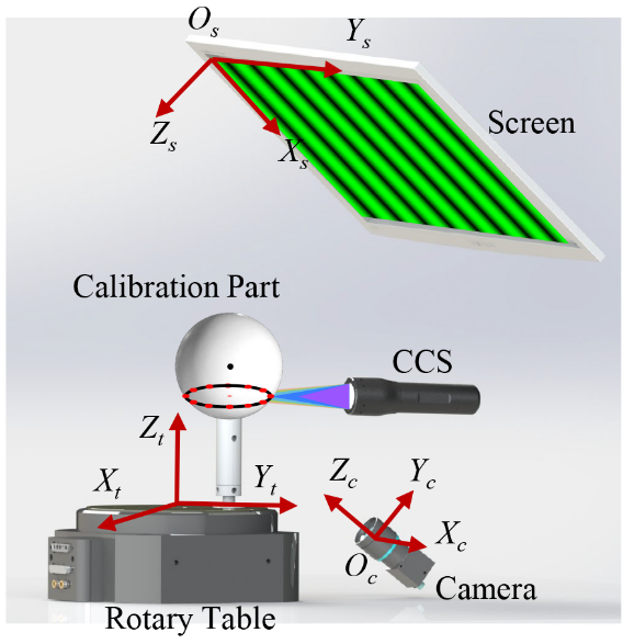 该工作的基本原理如图3所示,首先基于传感器测量不确定度建模构建多传感数据融合框架,并通过贝叶斯估计实现系统标定。随后,在标定先验约束条件下,完成共体元件多个功能表面的精确定位与系统参数优化。系统几何标定完成后,综合考虑传感器自身与系统参数的不确定度,重新更新系统的测量不确定度,并利用更新后的不确定度指导形位估计过程。其通过不确定度的更新与传递将标定参数本身的概率分布特性等先验信息嵌入测量模型中,提升了测量的精度与确定性。