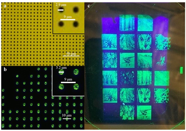 图2:(a)光刻胶显影后的晶圆显微图;(b)绿色量子点图案荧光图;(c)紫外灯下的全晶圆图案