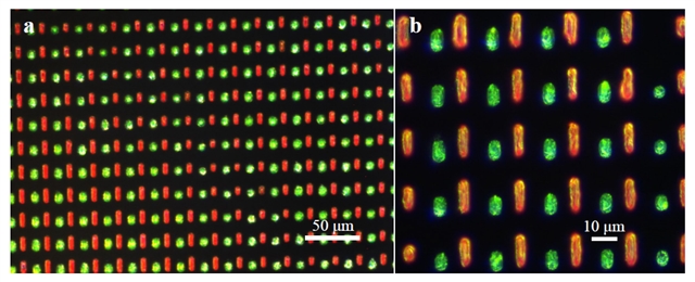 通过重复工艺,团队在单一基底上成功集成红色CdSe/ZnS与绿色CsPbBr3量子点。进一步将图案化量子点直接制备于蓝光GaN LED阵列上,验证了其作为色彩转换层的可行性。铝黑矩阵层有效阻挡背光泄漏,实现了高对比度的绿光发射。