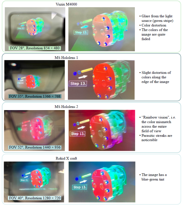 研究人员分别介绍了这几种代表性AR设备的技术特征和关键参数,重点关注其影响人体工程学的参数。从他们罗列出的数据来看,不同的光学设计方案也直接影响并限制了其图像质量。
