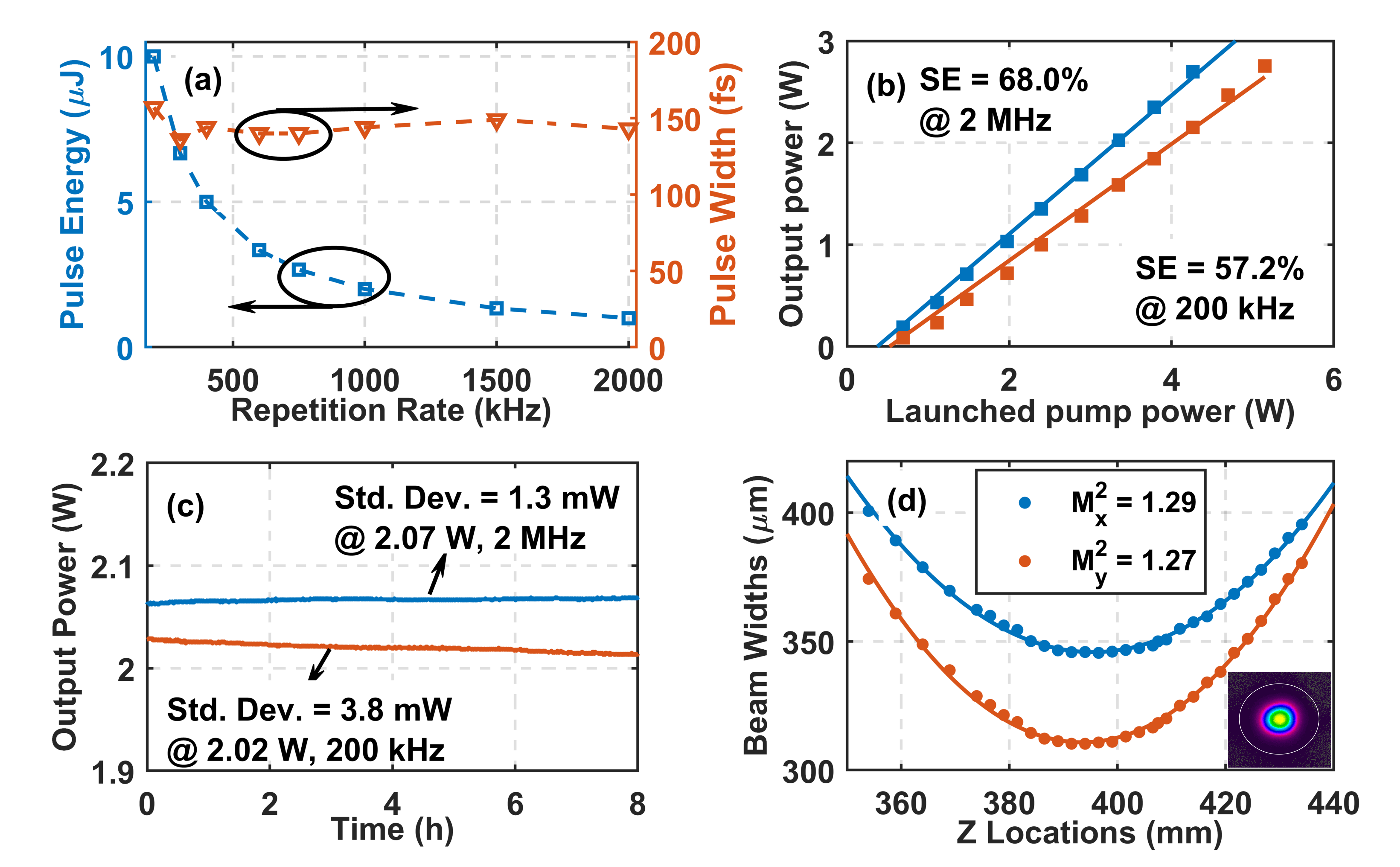 近期,中国科学院上海光学精密机械研究所科研人员在重频可调的微焦级超快光纤激光研究方面取得进展。研究人员基于光纤啁啾脉冲放大技术,采用定制的啁啾光纤布拉格光栅作为脉冲展宽器,并匹配透射式光栅压缩器的二阶、三阶色散,实现了脉冲能量微焦级的飞秒脉冲。研究显示,该光纤激光系统利用光纤式声光调制器进行脉冲选单,可实现脉冲重频在200kHz至2MHz范围内灵活调节,即在2MHz重频下,系统可输出1μJ、143fs的脉冲;在200kHz重频下,系统可输出10μJ、157fs的脉冲,且系统工作在其他重频下的输出脉冲宽度均小于180fs。该系统功率稳定性和光束质量优异,为实际应用提供了可靠性能保障。