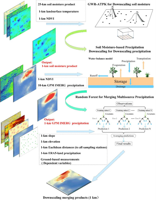 中国科学院成都山地灾害与环境研究所研究员赵伟团队联合中山大学科研团队,提出了基于高空间分辨率土壤水分的降水空间降尺度与多源数据融合模型(SMPD-MERG)相结合的混合降尺度框架,提升了卫星降水产品的精度与应用价值。这一方法融合GPM-IMERG卫星日降水产品、生成的ESA CCI 1 km土壤水分数据、ERA5-Land再分析降水数据以及地面测站观测数据,利用土壤水分平衡方程将原始GPM降水数据空间分辨率提升至1 km,并通过随机森林算法对多源数据进行集成,构建出高时空分辨率、精度优异的日尺度降水产品。