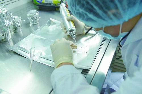 ① 夏欢进行古蛋白采样。