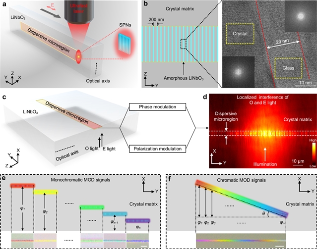 为了将光学色散压缩至微米尺度,本研究通过超快激光在铌酸锂晶体内部诱导亚波长相变纳米条纹(SPNs)构建色散微区(图1a)。由于超快激光与铌酸锂晶体相互作用过程中纳米等离子体的各向异性生长,焦点体积内的SPNs呈周期性排列,其中非晶态纳米条纹宽度约为20 nm,周期约为200 nm(图1b)。由于铌酸锂晶体和非晶相之间显著的折射率差异,根据有效介质理论,色散微区可等效视为各向异性介质层,对入射光的相位和偏振进行二次调制(图1c),从而在激光修饰区域内建立O光和E光的频率相关干涉(图1d),干涉光频率与O光和E光抵达色散微区时的相位差相关(图1e)。通过设计激光写入路径在晶体内部构建光楔结构,可以直接产生连续变化的相位差,简捷高效地实现三维空间微尺度光学色散(图1f)。