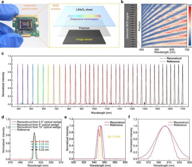 本文提出的MOD策略在片上集成光谱仪和光谱成像方面展现出巨大潜力。刻有色散微区的铌酸锂窗口与能够直接与CMOS图像传感器集成实现片上光谱探测,根据MOD元件的光谱响应函数和入射光MOD光强分布,即可重构出未知光源的光谱信息(图4)。MOD光谱仪在390-1710 nm的超宽波长范围内对单峰、双峰、宽谱均展现出灵敏、稳定的探测能力,其单色光重构半峰全宽可达3.94 nm,双峰重构分辨率达到4 nm,综合性能优于商用集成光谱仪。通过激光直写构建色散微区阵列,还可以实现光谱成像功能。值得一提的是,色散微区的创建完全通过自组织材料修饰实现,不依赖EBL等复杂微纳制造工艺,极大降低了应用成本。鉴于MOD元件优异的可扩展性、稳定性、可重复性和经济性,这种集成光谱探测系统有望大规模应用于包括环境监测、生物医学、食品安全和工业检测等多种场景,尤其是在极端条件下消耗性任务中具有显著优势。