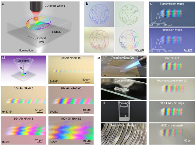 基于此方法创建的MOD元件展现出优异的性能。首先,光楔结构支持产生连续的宽带光学色散信号,构建的色散元件展示出涵盖紫外、可见光和近红外区域的超宽光谱响应,理论上仅受到铌酸锂晶体透明窗口的限制。其次,通过激光直写能够按需定制色散微区形状(图3a),从而直接在三维空间中显示复杂的色散图案(图3b),为多维信息记录、光学加密和多级防伪等提供新方案。SPNs引起的局部光调制使色散信号被严格限制在色散微区内,而非在空间上发散。通过对色散微区成像即可直接提取色散信号,兼容透射和反射两种工作模式(图3c),并且色散信号与成像视角无关(图3d)。相较于传统精密光学色散元件,色散微区在全无机晶体基质的保护下表现出极强的稳定性,使得MOD元件能够承受600 ℃高温、强酸腐蚀、污染、机械损伤等各种极端环境,对震动、冲击等外部扰动均不敏感(图3e)。