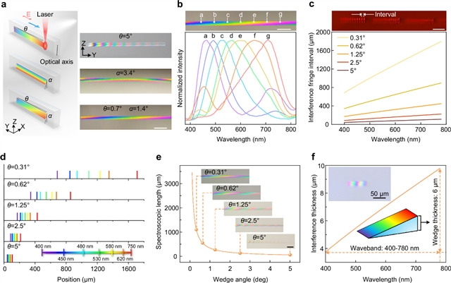 通过精准调控光楔角度及取向,可以设计MOD的光学特性。例如,在三维空间中扭转色散微区能够精细调整其分光方向与模式(图2a, b);调节楔角大小则可控制不同频率光干涉的条纹间距,进而调控MOD的整体工作尺寸(图2c-e)。基于此原理,可以将色散区域长度压缩至50 µm,宽度减小至10 µm,光楔厚度仅为6 µm(图2f),从而在极紧凑的空间内实现整个可见光波段的有效色散,使得基于传统架构的光学元件在尺寸上首次可与超材料相媲美。这种超紧凑设计允许MOD元件能够集成于块体、各类基板以及薄膜等多种衬底之中,展现出优异的通用性和可集成性。