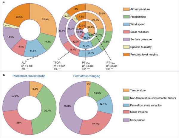 这一研究揭示了气候与环境因子协同作用下青藏高原多年冻土退化机制的影响路径,强调了非温度因子在多年冻土退化中的作用,突破了以往“气温主导”多年冻土变化的认识,为改进碳、水、养分循环模拟和保障青藏高原重大工程设施安全提供了新思路。