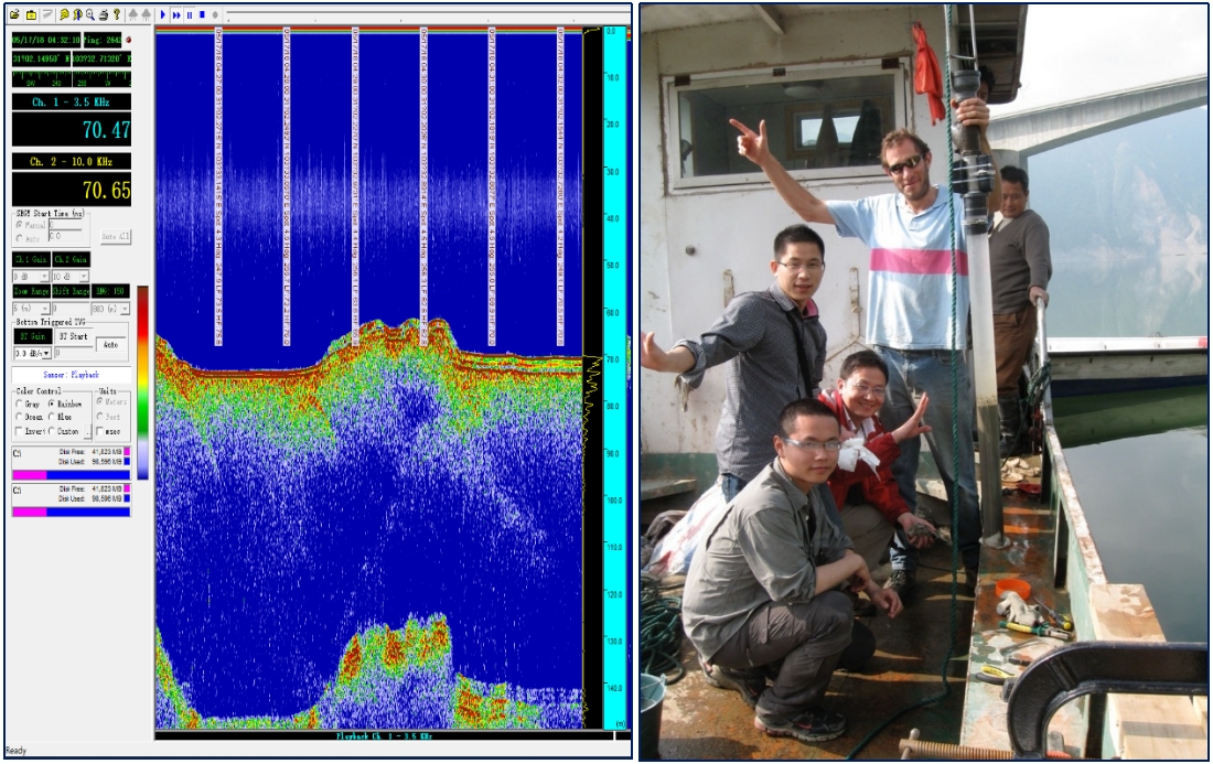 为回答这一国际科学难题,自2009年开始,该研究团队每2-3年一次在紫坪铺水库进行沉积物声学扫描和取样。通过分析2012、2015和2018年水库沉积物的累积厚度变化,结合滑坡体和河床粒度实地测量、钻孔精确沉积厚度和组成等大量野外调查数据,定量获得了地震前后沉积物通量、产率及其河床沙组分的变化。