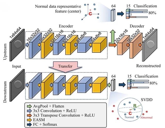 这一设计使得模型能够同时执行多个任务,如图2所示,在上游阶段,模型通过解决分类和重建任务来训练现有缺陷的编码器,这一过程进行了充分的预训练,使其能够学习并提取已知缺陷的内在特征表示,避免了传统方法中将所有已知缺陷简单归为单一正常类别所导致的局限性;在下游阶段,编码器通过分类任务和深度支持向量域描述(Deep-SVDD)进行微调,能够区分新缺陷与已知缺陷。这种多任务协同学习的方式不仅有效地提高了模型对新型缺陷的识别能力,还通过共享编码器的设计,避免了重新训练,极大地提升了检测效率。