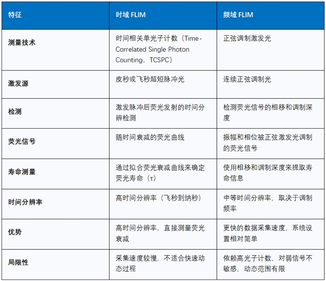 FLIM主要分为两种技术路径:时域FLIM和频域FLIM。它们各有优劣,适用于不同的应用场景。