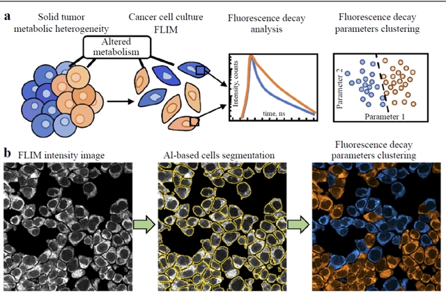 图2:FLIM 评估肿瘤代谢异质性的示意图。a FLIM 分析肿瘤代谢异质性的示意图,重点展示了从代谢改变检测到荧光衰减参数聚类的过程。b FLIM 数据处理流程:(左)FLIM 强度图像,(中)基于 AI 的细胞分割,(右)荧光衰减参数聚类