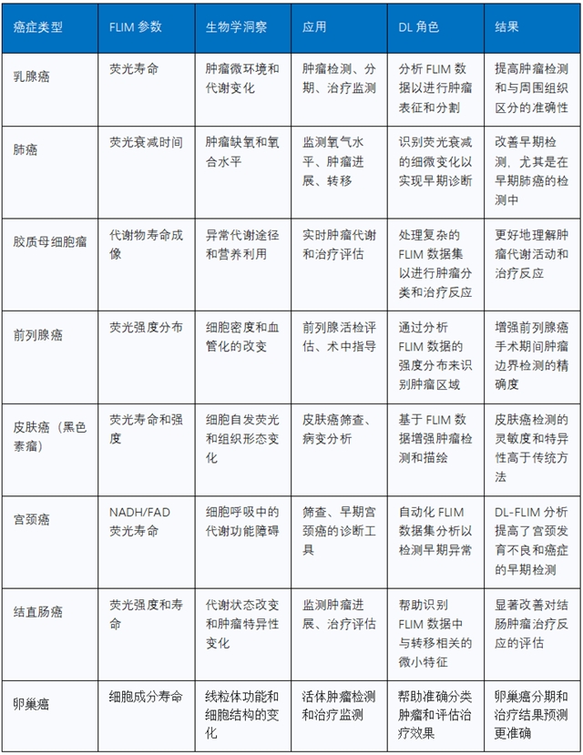 深度学习在这一过程中发挥了关键作用。AI辅助的细胞分割技术可以精确识别单个细胞,并对荧光寿命参数进行聚类分析,从而深入理解肿瘤微环境内的异质性。下表概述了FLIM与DL在不同癌症类型中的具体应用。