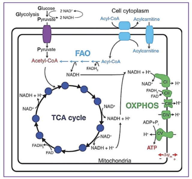 图3:NADH和FAD参与细胞能量代谢的示意图,阐明它们在糖酵解、脂肪酸氧化(FAO)、三羧酸(TCA)循环和氧化磷酸化中的关键作用