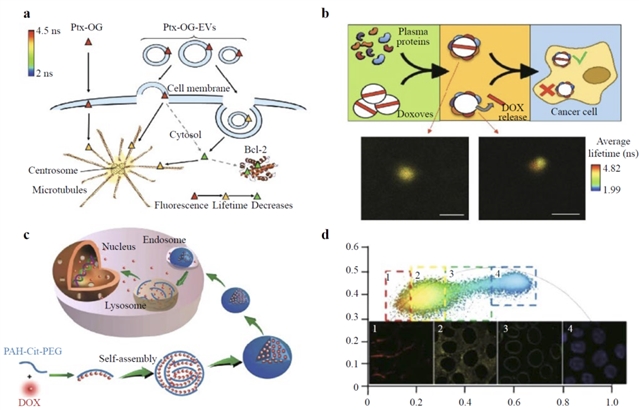 应用案例: FLIM-FRET被用于研究化疗药物如紫杉醇(Paclitaxel,PTX)和多柔比星(Doxorubicin,DOX)的细胞摄取和释放机制,揭示了外泌体(Exosomes,EXOs)和微囊泡(Microvesicles,MVs)不同的药物递送途径。一项研究利用FLIM区分了金-DOX纳米复合物(Au-Dox)在癌细胞和健康心肌细胞中的不同内化路径,解释了其选择性毒性的机制,为减少化疗副作用提供了依据。此外,FLIM还能通过检测细胞核荧光寿命的早期变化,评估达沙替尼(Dasatinib)等抗癌药物的疗效,甚至可以在单细胞分辨率下生成药效剂量-反应曲线。