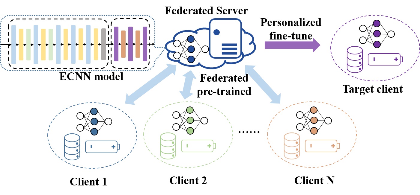 在本工作中,合作团队提出了一种两阶段联邦迁移学习框架。在第一阶段采用联邦迁移学习框架,使多个分布式电池通过共享模型参数,协作训练全局模型,既可以学习通用知识又保护了数据隐私;在第二阶段,利用目标电池的少量本地数据对该全局模型进行微调,建立捕获个体电池特征的个性化模型。联邦迁移学习框架构建在轻量级卷积神经网络上,并通过有效的通道注意机制提升了其性能。实验结果表明,该框架在公共快充电池数据集上的预测性能优于传统方法。