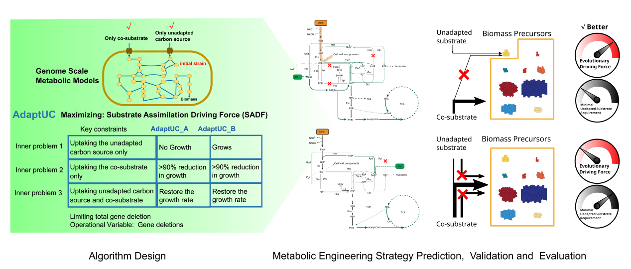 针对上述问题,中国科学院天津工业生物技术研究所研究员马红武和副研究员蔡敬一、袁倩倩团队提出了AdaptUC框架,即基于基因组尺度代谢模型与双层混合整数规划的一体化生信设计工具,用于自动预测ALE所需的起始菌株敲除组合。AdaptUC引入了两类评价指标:一是未适应碳源/共底物利用比(UC/Co),用于衡量对新碳源的依赖度;二是该研究提出的创新性目标函数底物同化驱动力(SADF),以每单位未适应碳源摄取所带来的生长增益来量化进化驱动力,直接对应ALE中逐步削减共底物时的选择压力。相较于传统的最大化单一通量设计策略,SADF更关注“单位摄取→单位生长”的回报率,从而更贴合阈值降低式的进化实验设计。