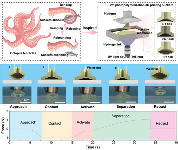 研究构建仿章鱼的自适应水凝胶吸盘。章鱼作为自然界的“界面工程大师”,其吸盘结构依靠可形变的柔软肌壁精确调节腔内压力,既能够在干湿环境、光滑与粗糙表面间迅速完成粘/脱附切换,又可以精准控制吸附力大小。这种高度自适应特性使其在水下抓取、生物医疗等场景中具备优势。顺应机器人技术、生物工程与柔性电子等领域的发展,构建具有章鱼吸盘式功能的仿生粘附器件,已成为破解传统刚性粘附设备在复杂界面适应性差、易损伤脆弱目标等痛点的关键路径。