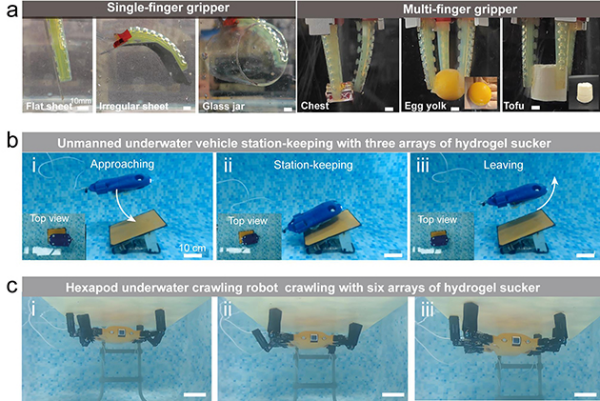 为凸显非破坏性粘附的实用性,该研究研制了采用液压驱动、配备仿生吸盘的水凝胶夹持器,可自适应地操纵各种水下物体,能够应对曲面复杂的物体甚至还可以温和处理蛋黄、豆腐块等脆弱食品。同时 ,研究将这类水凝胶吸盘阵列结构集成到水下无人航行器的腹部和六足机器人的足端,赋予其水下操控物体、定点停留及表面爬行等特殊功能,为复杂海洋环境场景中的应用提供了高适形、可逆、低损的粘附手段。