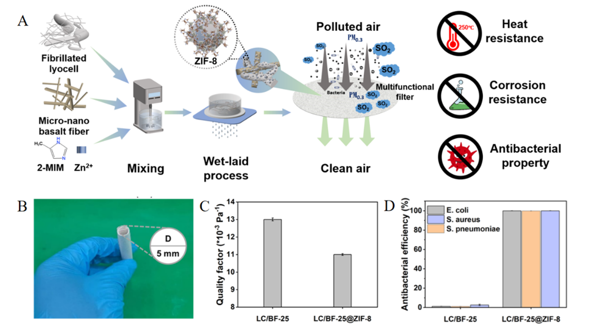 科研人员进一步通过在复合滤材表面原位生长沸石咪唑酯骨架(ZIF-8),赋予其优异的空气净化和抗菌性能,滤材对PM0.3的过滤效率达到97.72%。ZIF-8表面功能化显著提升了滤材对有害气体的吸附性能,SO2吸附量提升约93%,甲苯吸附量提升约111.5%,表现出协同捕获颗粒物与有害气体的能力。玄武岩纤维赋予滤材优异的耐热性,在250 °C下可维持稳定的过滤性能。