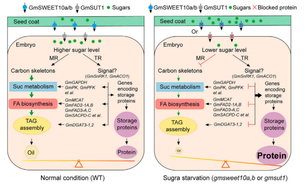 大豆种子中糖水平调控油分-蛋白平衡的模型