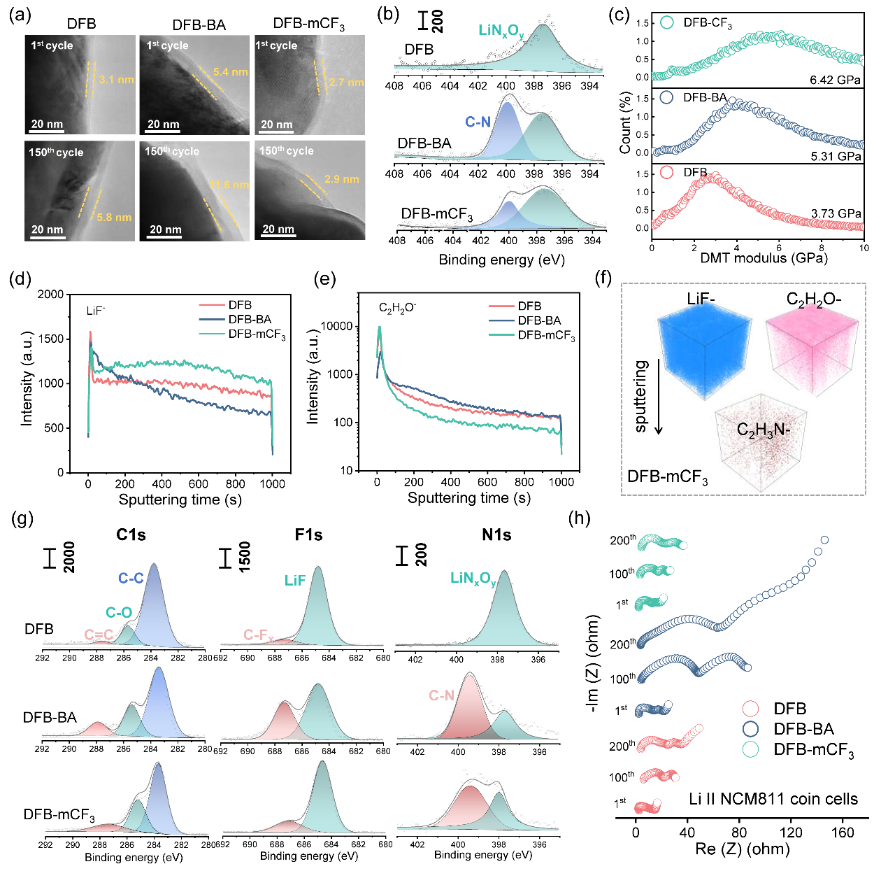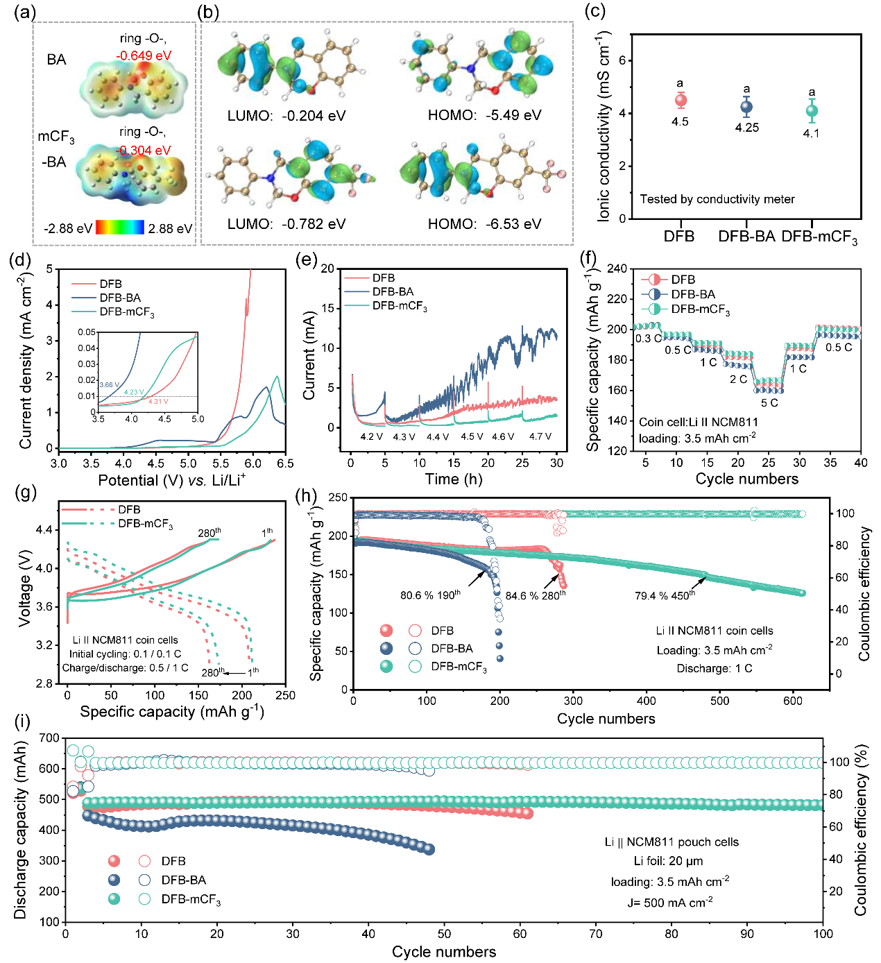 图2:BA/mCF3-BA添加剂在LiNCM811电池中的电化学稳定性与电化学表现。