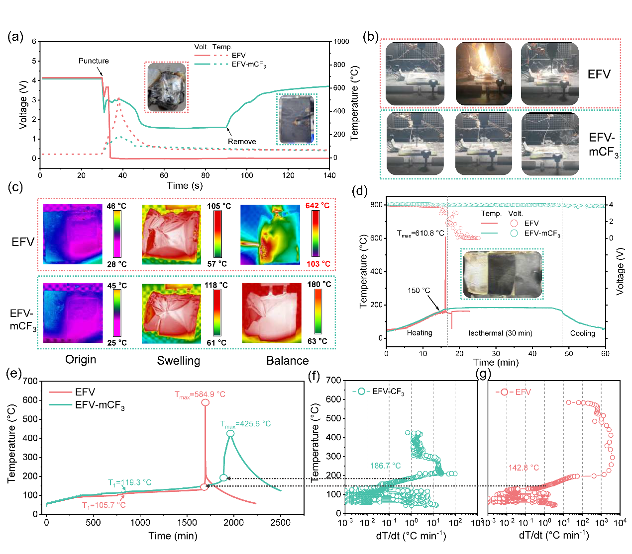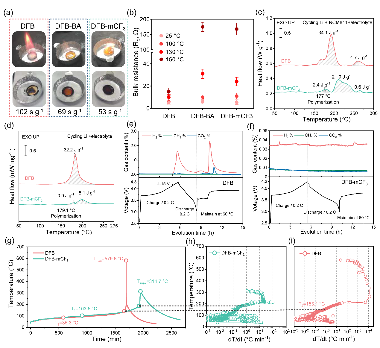 为了解决这些难题,该工作报道了一个简单有效的策略,旨在消除与锂金属和NCM811材料相关的安全失控隐患。作者设计合成了3-苯基-7-(三氟甲基)-3,4-二氢-2H-1,3-苯并恶嗪(mCF3-BA)作为锂电池全阶段智能热响应添加剂,以消除锂电池的热失控安全隐患。该添加剂在电池正常循环时可参与形成的稳固的CEI/SEI界相,在热失控下会发生快速聚合,从而达到电化学性能和安全性之间的平衡。该锂电池全阶段智能热响应添加剂的工作机理示意如下(图1):(1)在电池正常循环期间,部分mCF3-BA在电极表面聚合,参与形成均匀、富含LiF和耐高温的CEI/SEI界相。LiNCM811锂金属电池的界相失效温度T1从85.3 ℃提升至103.5 ℃,Si@Gr450NCM811锂离子电池T1从105.7 ℃提升至119.3 ℃;(2)随着温度升高至热失控阈值温度,mCF3-BA发生快速聚合,在电池内形成绝缘的聚苯并噁嗪树脂凝胶,从而有效抑制负极和正极材料之间的化学串扰和电化学反应。LiNCM811锂金属电池的热失控温度T2从153.1 ℃提升至187.6 ℃,Si@Gr450NCM811锂离子电池的T2从142.8 ℃提升至186.7 ℃。