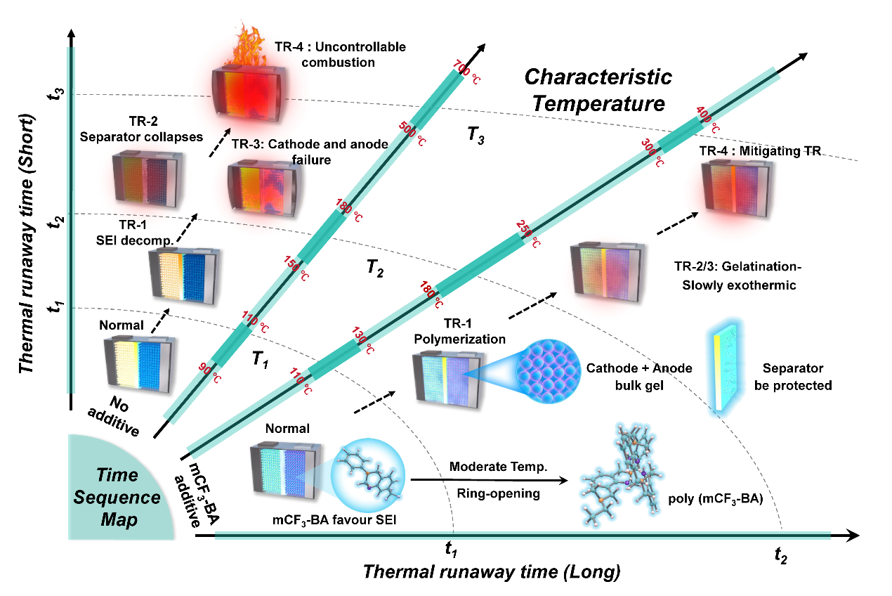 高能量密度锂电池广泛应用于电动汽车和便携式电子产品,但面临热失控和爆炸的严重安全风险。目前的解决方案,如阻燃添加剂或固态电解质,通常会损害能量密度或制造性,难以平衡电池性能和安全性。为解决这一难题,该工作提出了一种锂电池全阶段智能热响应添加剂(氟代苯并噁嗪)的解决方案。在电池正常循环期间,该添加剂参与形成稳固的固态电解质界相(SEI/CEI),从而增强电池循环稳定性和提高循环寿命。在锂电池发生热失控时,其迅速聚合成绝缘的热固性聚苯并噁嗪树脂凝胶,阻断正负极电化学串扰与抑制电解液副反应发生,将锂电池的热失控阈值提高34.5℃-43.9℃。