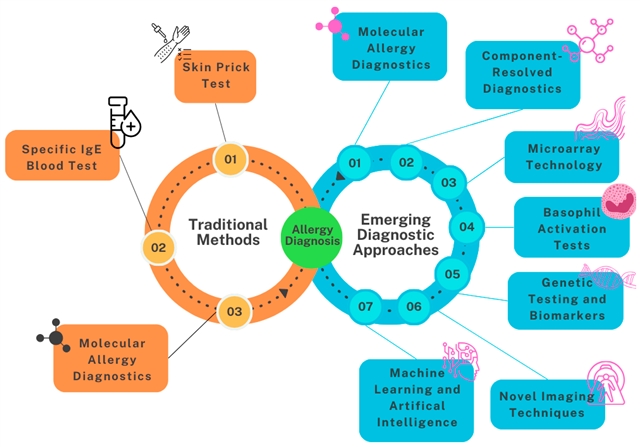 花生过敏已成为日益严重的公共卫生问题,其特点是患病率不断上升,且可能引发严重过敏反应。传统的诊断方法,例如皮肤点刺试验和血清IgE检测,虽然是基础方法,但在特异性、敏感性和风险方面往往存在不足。这推动了创新诊断技术的发展,包括成分解析诊断、嗜碱性粒细胞活化试验、基于微珠的表位检测、分子诊断和人工智能应用。