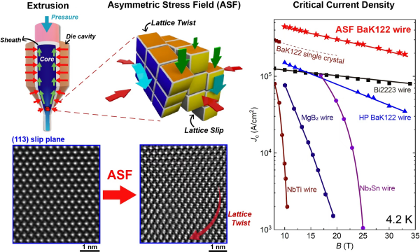 针对上述问题,中国科学院电工研究所研究员马衍伟团队等提出了基于非对称应力场的高密度磁通钉扎中心构建策略,显著提升了铁基超导线材的高场载流性能。该研究采用规模化挤压成形技术,实现了静水压力与剪切应力的协同调控,促使刚性晶格发生局部滑移与扭转,诱导出高密度位错,并进一步通过热处理优化实现了位错的有序排列,最终形成高效磁通钉扎网络,增强了强磁场下的磁通钉扎力。采用新策略制备的铁基超导线材临界电流密度(Jc)提升,其中10 T的Jc从此前报道最高值1.5×105 A/cm2提升至4.5×105 A/cm2,30 T的Jc提高了5倍达到2.1×105 A/cm2,创造了铁基超导线材载流性能新纪录。