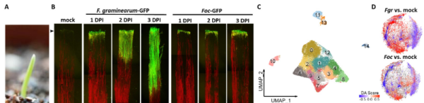 该研究首次在单细胞分辨率上揭示了小麦幼苗响应非寄主镰孢菌侵染的免疫反应局域化特征,提出了禾谷镰孢菌推迟和减轻小麦的早期免疫反应与寄主建立易感互作关系。研究结果为小麦抗赤霉病育种提供了新的理论依据和更多的抗病候选基因。