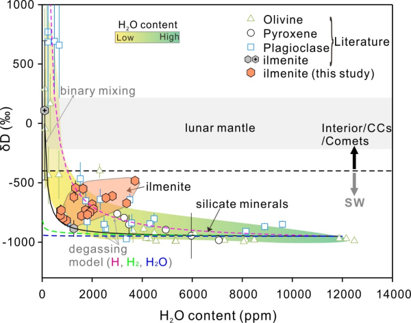 月壤中钛铁矿和硅酸盐相的水含量与δD分布图