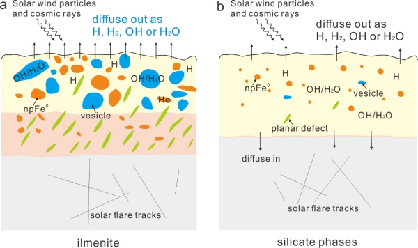 钛铁矿和硅酸盐矿物太空风化层中太阳风H的注入、迁移与逸出示意图