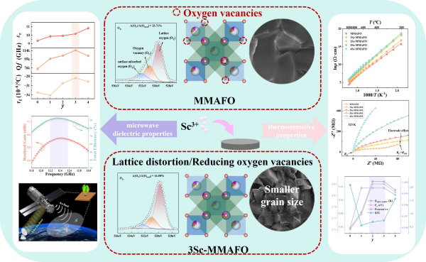 近期,研究人员针对Mg-Al-Mn-Fe-O尖晶石陶瓷在高温下电学性能非线性及微波损耗等问题,提出了基于Sc3+晶格锚定效应调控价态平衡,同步抑制氧空位扩散并强化八面体键价的策略。实验结果表明,在200℃至1000℃超宽温域内实现了高度线性热敏特性,满足宽温域温度传感的线性度需求。同时,研究实现了尖晶石陶瓷低εr、超高Q·f 及近零τf的平衡。基于该材料制备的圆柱介质谐振天线在12 GHz卫星通信频段实现了92%的辐射效率与6.28 dBi的增益,验证了其在卫星通信前端模块中的工程应用潜力。