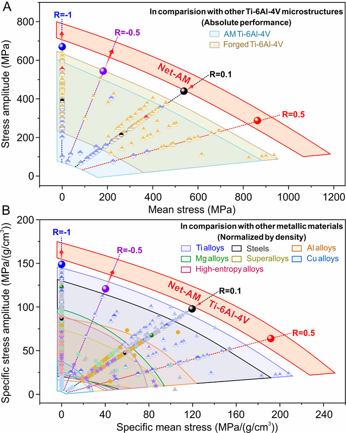 针对上述问题,该研究系统揭示了钛合金易发生疲劳开裂的三类典型“疲劳短板”及其应力比敏感区间,发现了无微孔净增材制造(Net-AM)组织可实现三类疲劳短板的协同优化。同时,研究人员提出,3D打印钛合金在全应力比条件下仍具有天然高的抗疲劳特性。进一步,基于团队前期原创的NAMP工艺,研究人员制备出近似无微孔的Net-AM组织Ti-6Al-4V合金,并对其在不同应力比条件下的疲劳强度和疲劳开裂机制进行了表征。大量数据对比分析表明,在全应力比范围内,Net-AM组织Ti-6Al-4V合金的疲劳强度整体优于所有钛合金材料,且其比疲劳强度(疲劳强度除以密度)也全面优于所有金属材料。
