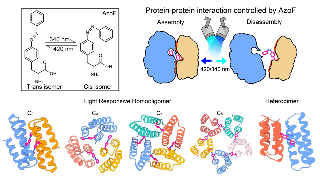 课题组开发了一套可适用于非天然氨基酸的蛋白质对接程序,通过整合光响应非天然氨基酸AzoF与蛋白质密码子扩展技术,从头设计出了一系列可逆的光响应性蛋白(图1)。该研究为光遗传学以及新型生物材料开发提供了新的元件,并为光驱动蛋白质机器的从头设计打下了基础。