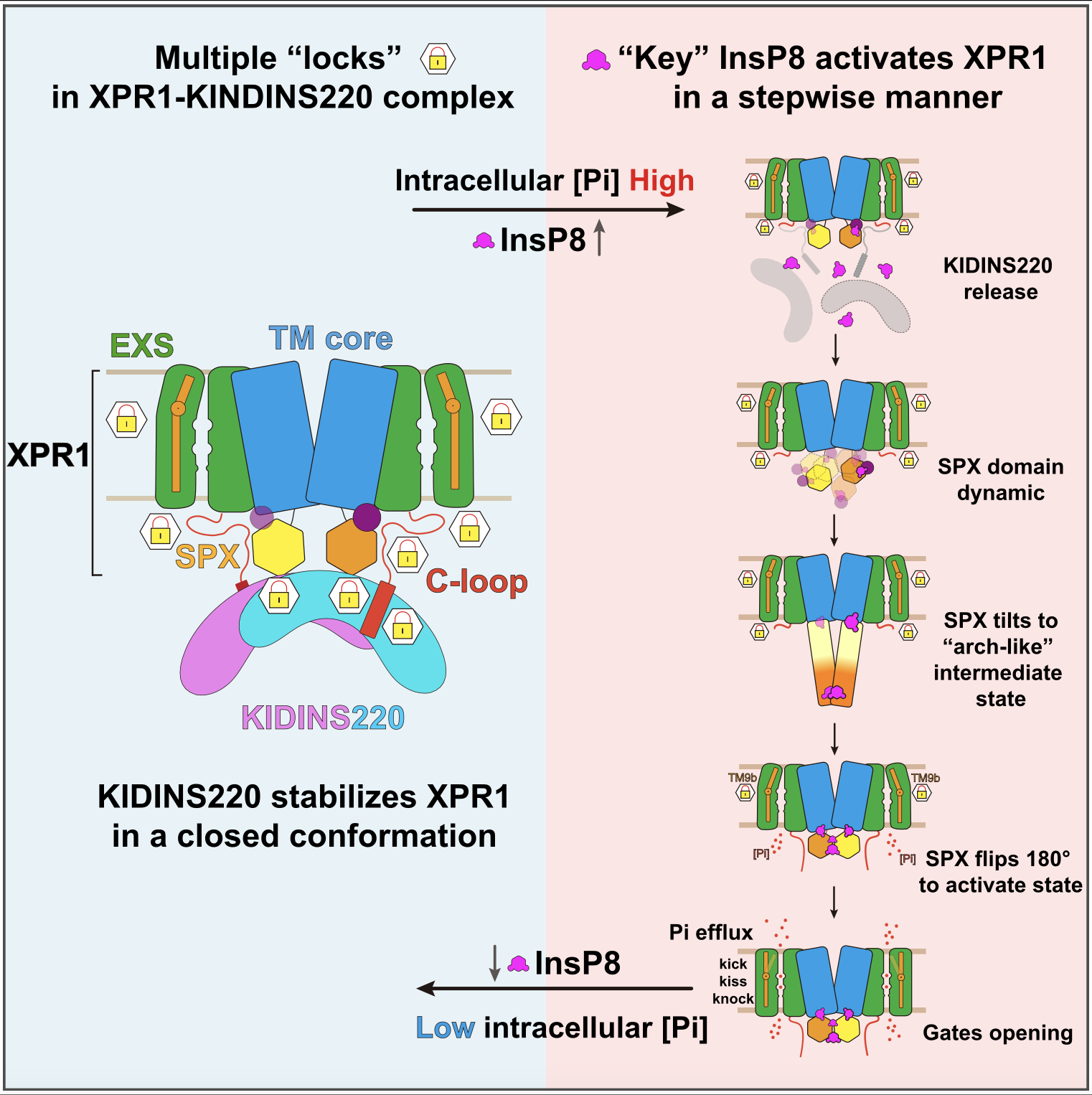 KIDINS220和InsP8调控XPR1磷酸盐转运活性模型