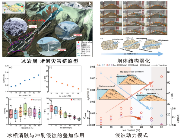 相关研究成果以Investigation on the breach mechanism of ice-containing blockage dams: Insights into the impact of ice melting on overtopping erosion为题,发表在《工程地质学》(Engineering Geology)上。研究工作得到国家自然科学基金、中国科学院有关项目的支持。