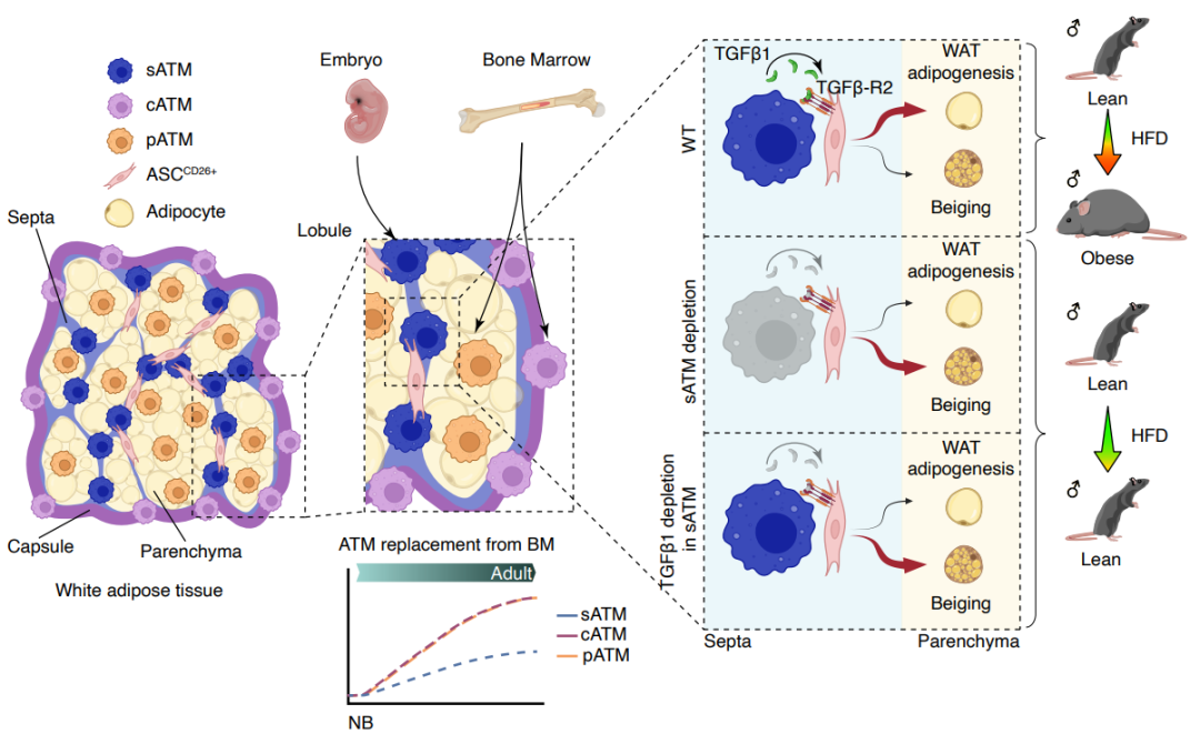 研究人员发现了一类稀有的CD209b+LYVE1+隔膜巨噬细胞(sATMs),它们特异性定位于白色脂肪组织(WAT)的小叶隔膜内——这是一个富含胶原蛋白与透明质酸的微环境,同时也是CD26+多能ASCs的聚集区域。这类巨噬细胞主要源于胚胎发育阶段,并能长期维持其生态位特性。