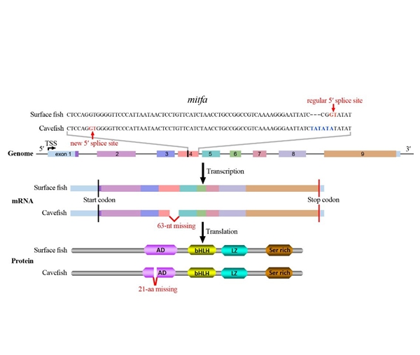 相关研究成果以A Splicing Mutation in mitfa is Involved in the Depigmentation of Cavefish Triplophysa rosa为题,发表在《分子生物学与进化》(Molecular Biology and Evolution)上。研究工作得到国家自然科学基金委员会等的支持。