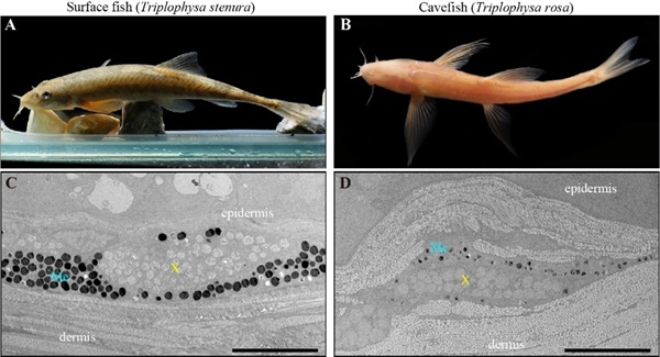 研究揭示洞穴鱼玫瑰高原鳅色素退化分子机制。洞穴鱼类因长期生活在黑暗的地下水域,逐渐演化出眼睛、色素退化、嗅觉增强等特征,是研究适应性演化和趋同演化的理想模型。此前,有研究揭示多个色素相关基因突变与洞穴鱼类色素退化相关,但学界对其分子机制和演化驱动力尚不明晰。