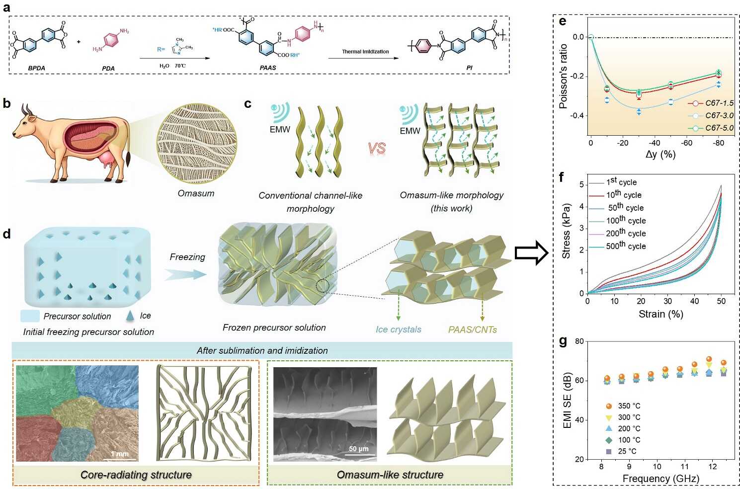 聚酰亚胺/碳纳米管气凝胶的结构设计与性能:(a) 聚酰亚胺的合成路线;(b) 牛肚微观形貌示意图;(c) 多孔电磁屏蔽材料常规孔道形貌和本工作中提出的类牛肚状形貌的对比;(d)聚酰亚胺/CNT气凝胶制备过程;(e) 气凝胶的负泊松比;(f) 气凝胶的循环压缩性能;(g) 气凝胶的高温电磁屏蔽性能。