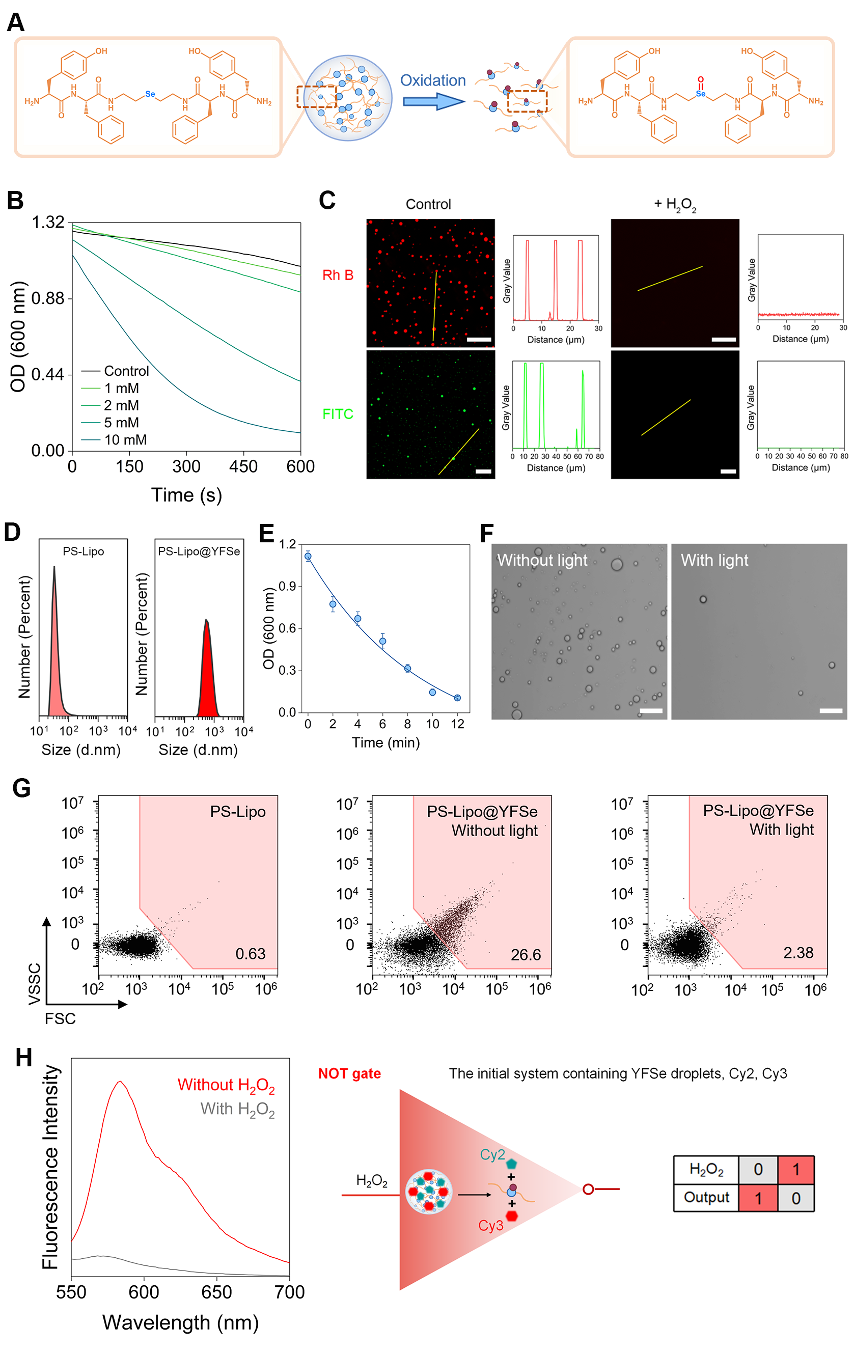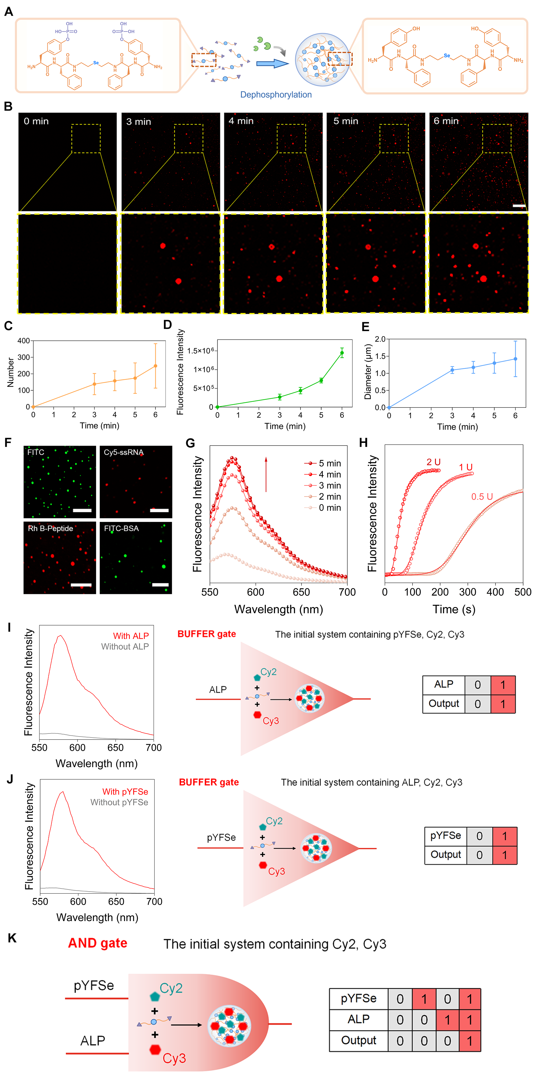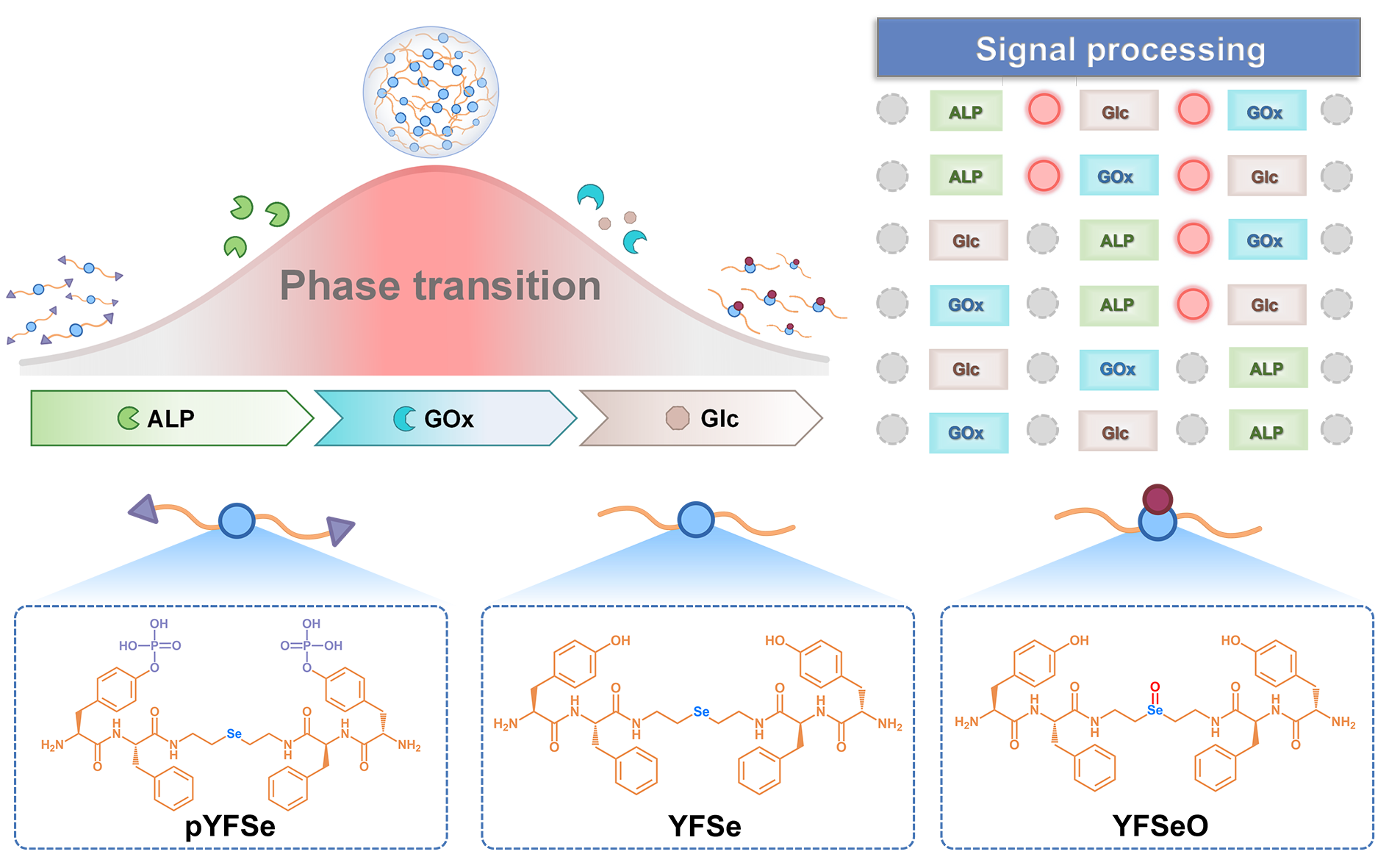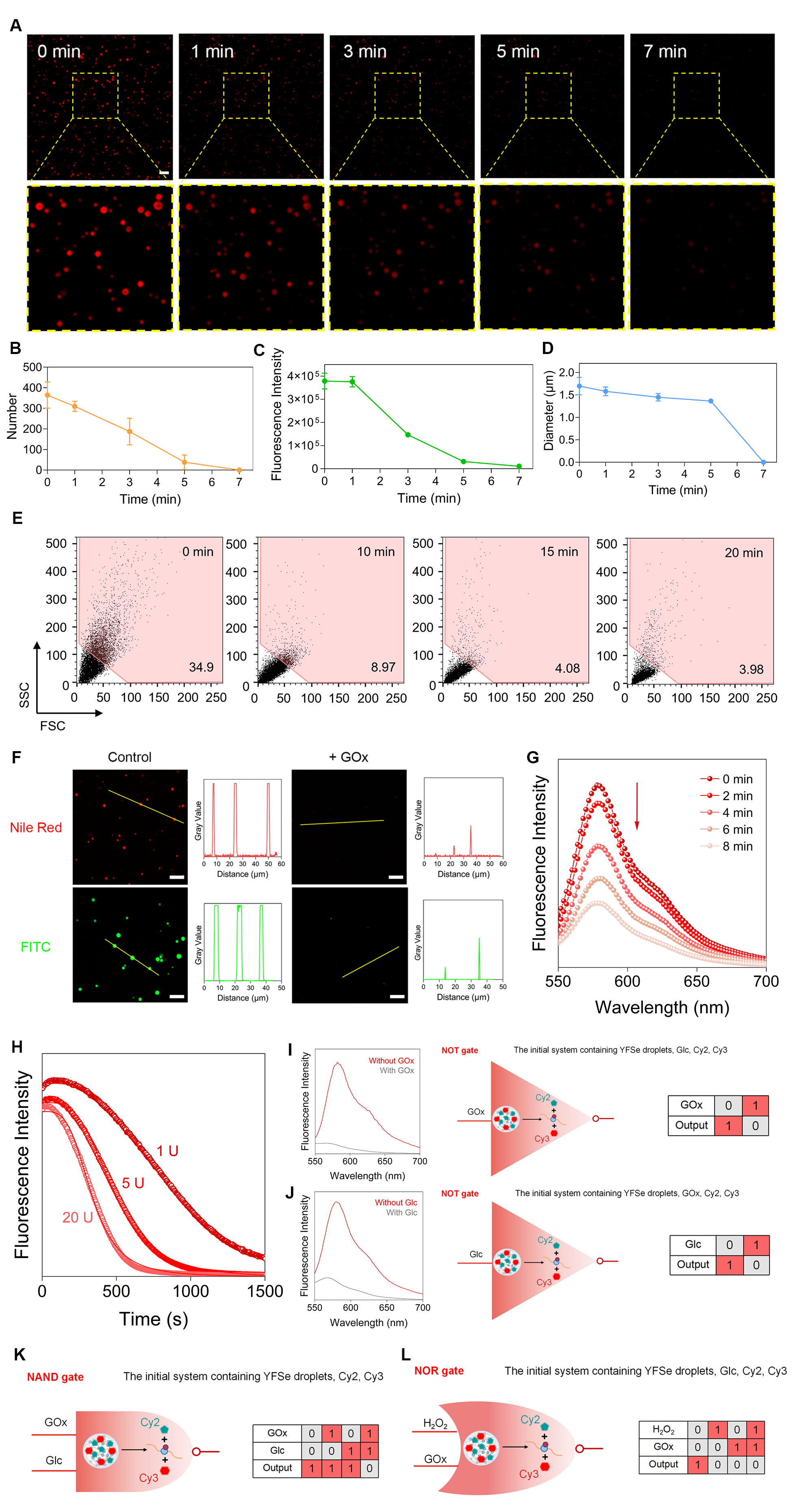 在这项工作中,作者基于相分离蛋白中sticker-spacer-sticker的分子语言特征,设计了相分离前体多肽分子pYFSe。其可在碱性磷酸酶(ALP)作用下快速去磷酸化并转化为多肽分子YFSe,后者通过分子间的多价相互作用发生液-液相分离,形成了微米尺度的凝聚体组装体。YFSe凝聚体可高效富集和装载多种客体分子(小分子、多肽、核酸以及蛋白)。由于多肽YFSe的柔性spacer中硒醚对活性氧(ROS)的易感性,过氧化氢可以直接将硒醚氧化为硒亚砜,从而提升了多肽的亲水性,导致凝聚体的解体和客体分子释放。相似地,通过将光敏剂装载到YFSe 凝聚体中,利用光诱导的活性氧产生也可以触发硒醚的氧化和凝聚体的崩解。进一步,通过引入葡萄糖氧化酶(GOx)催化反应生成过氧化氢,同样可以推动YFSe的分子结构改变与凝聚体解组装。作为信号传递调控的概念验证,作者以荧光共振能量转移(FRET)体系(Cy2/Cy3)为模式信号单元,实现了对酶促相变反应动力学的实时监测与信号传导效率量化。更进一步,通过组合输入生物信号分子(酶与底物),成功构建了AND、NOR、NOT、NAND等基础逻辑门,并演示了级联逻辑运算能力。该体系首次将酶促反应与非平衡相分离耦合,实现了生物分子水平的信号编程与处理。