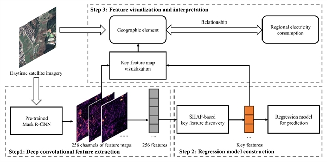 本研究提出了一个三阶段的可解释回归(XRegression)框架:(1)特征提取:利用深度学习模型 Mask R-CNN 与特征金字塔网络(FPN)提取高分辨率图像中的多尺度空间特征。(2)特征筛选:使用随机森林回归结合 SHAP 模型,识别对用电预测影响最大的关键图像特征。(3)特征可视化解释:通过特征图激活分析,结合乡村地理知识,揭示图像中新建农房道路通达性农田林地等地理要素与用电水平之间的关系。该方法以广东省新兴县547个500m×500m栅格为样本单元,模型预测精度达到 0.797 的相关系数水平,显著优于传统方法。
