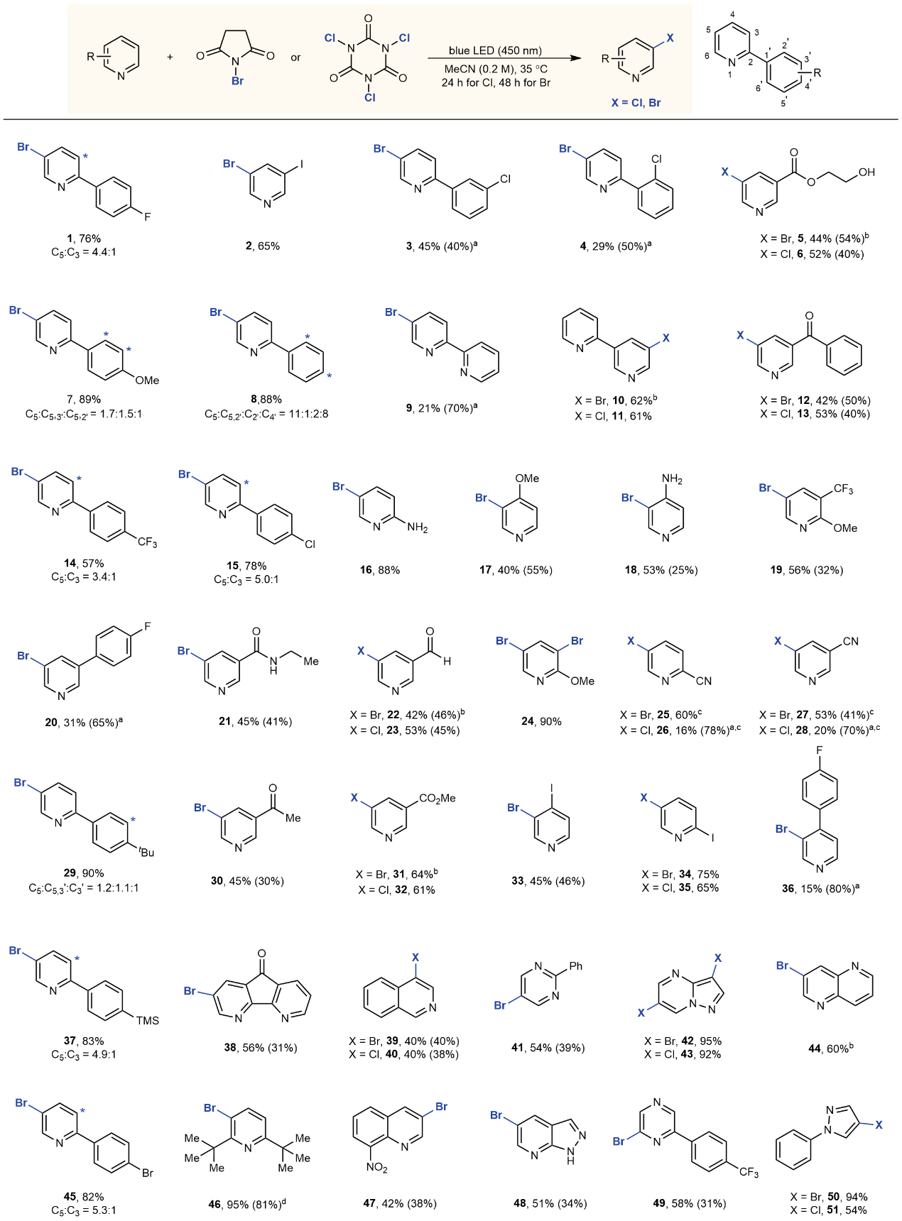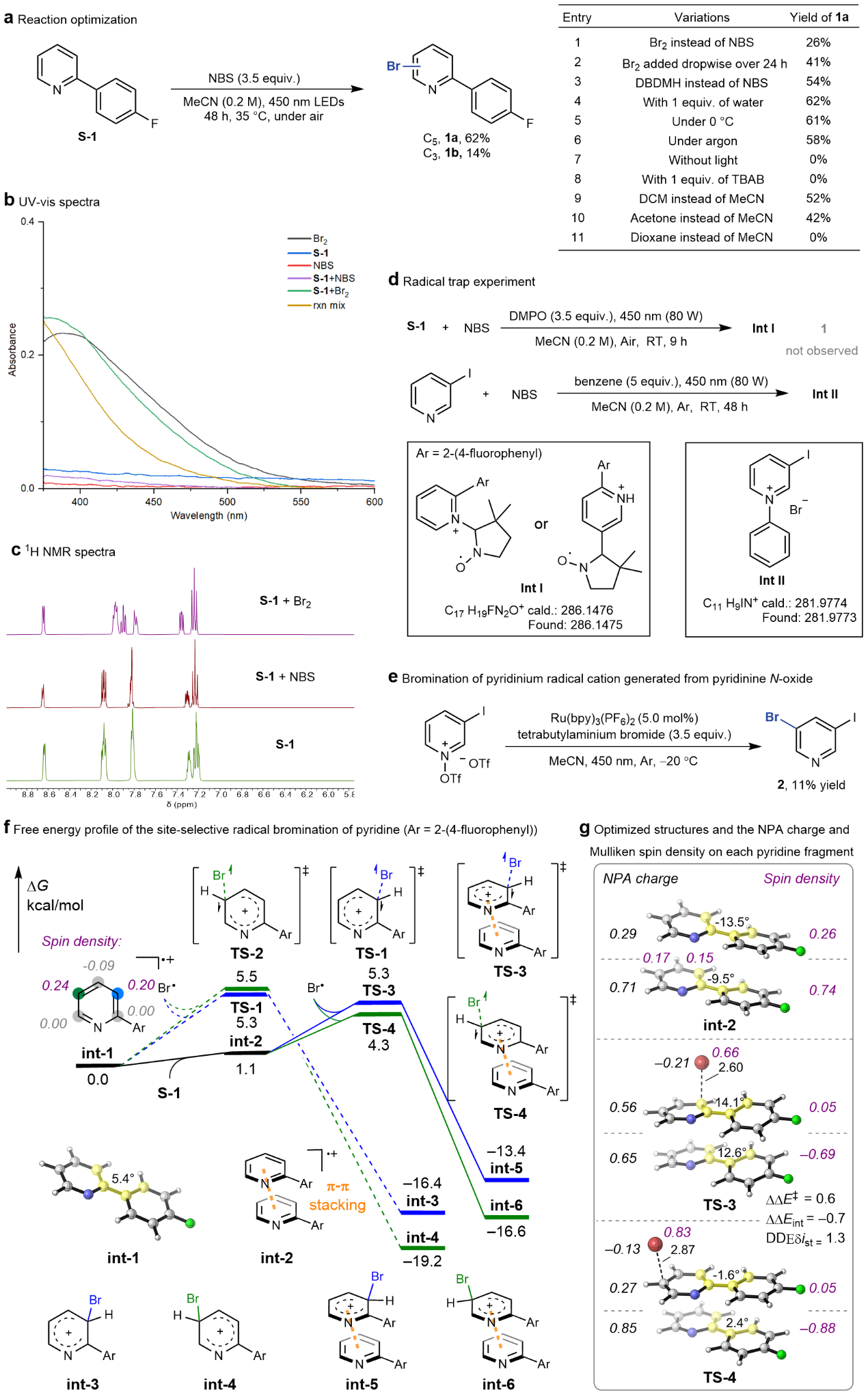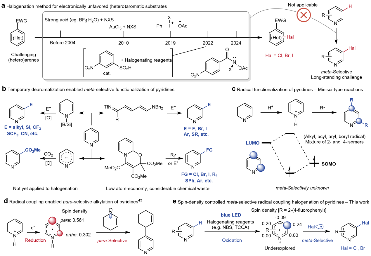 针对上述问题,武汉大学程强、戚孝天团队合作发展了一种自旋密度调控的直接间位选择性吡啶C–H卤化反应。该反应具有条件温和、操作简单的特点,将商品化的NBS和TCCA等试剂与吡啶底物在未除水除氧处理的试剂级乙腈中溶解,空气中蓝光光照下即可发生相应反应。反应中产生的吡啶自由基阳离子中间体主导了间位选择性,该中间体保留了吡啶的固有亲电性,与极性反转的暂时去芳构化策略存在本质差异(图1e)。