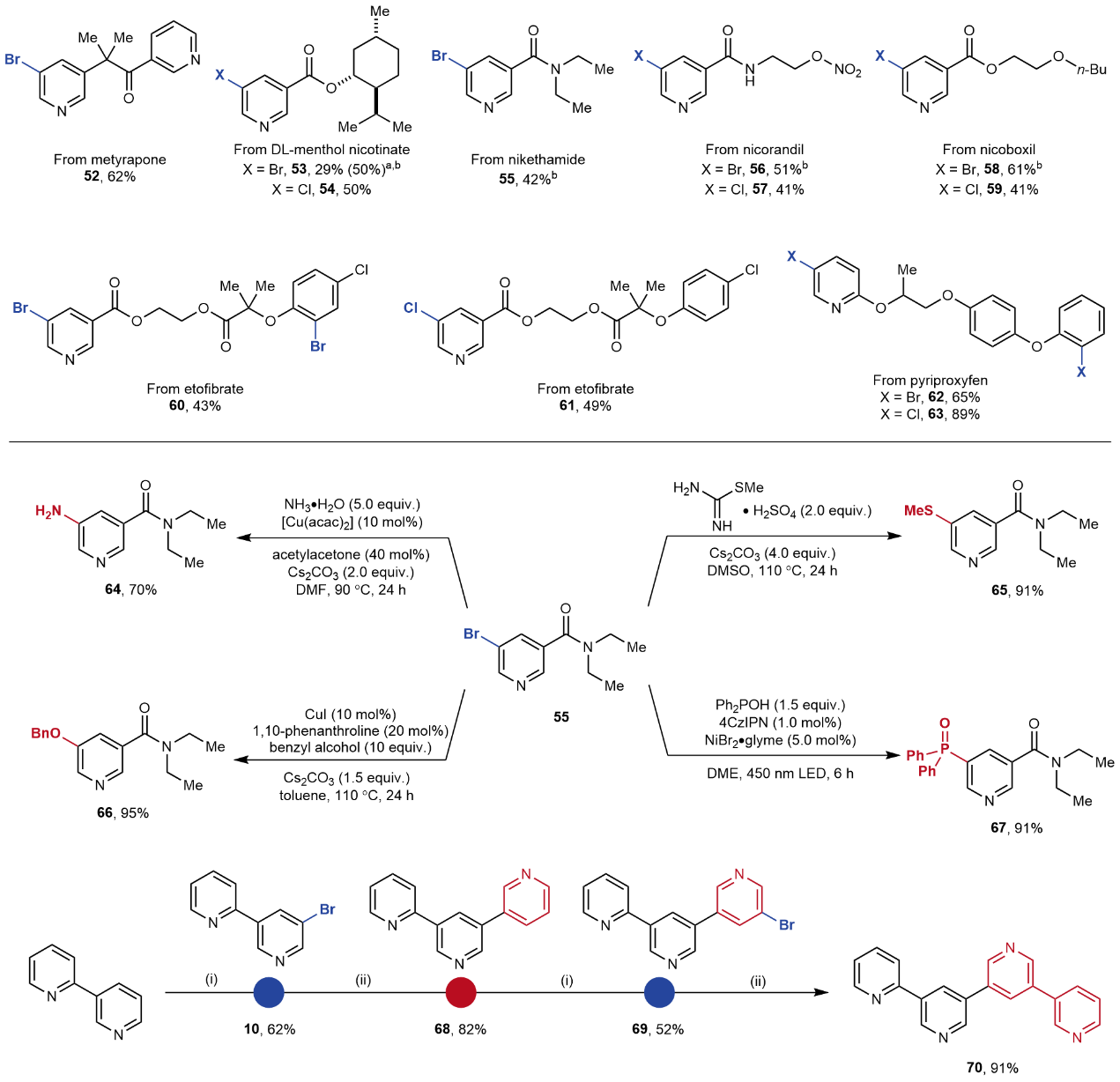该方法具有良好的底物适应性和官能团兼容性。尤其是带有缺电子取代基的吡啶也可以高间位选择性得到卤化产物。除吡啶外,其它的含氮杂环如喹啉、嘧啶、萘啶、吡嗪、吡唑等也适用于该反应体系(图3)。同时,该方法可以应用于药物分子的后修饰,以高间位选择性得到吡啶卤化产物,如果存在较富电子的芳环,则可能会出现芳环同时卤化的产物。间位溴化的吡啶可以发生多样化的转化,如氨化、醚化、硫醚化、膦酰化等,也可以结合偶联反应实现连续转化,这种聚吡啶的结构可能在材料方面具有潜在应用价值(图4)。