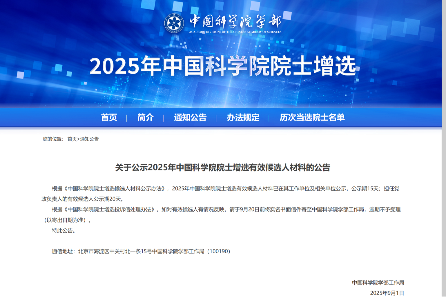 2025年中国科学院院士增选有效候选人材料公示。