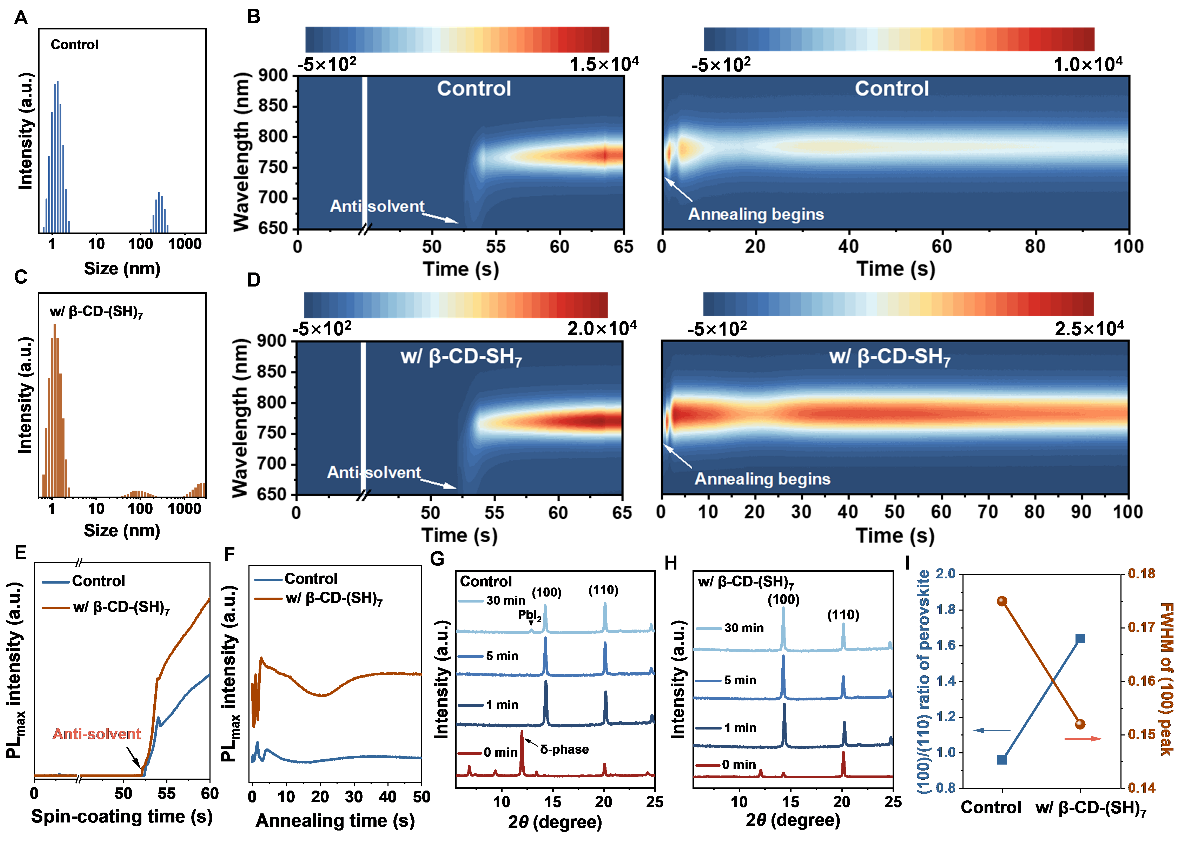图3:β-环糊精-(SH)7对钙钛矿成核与结晶过程的影响。