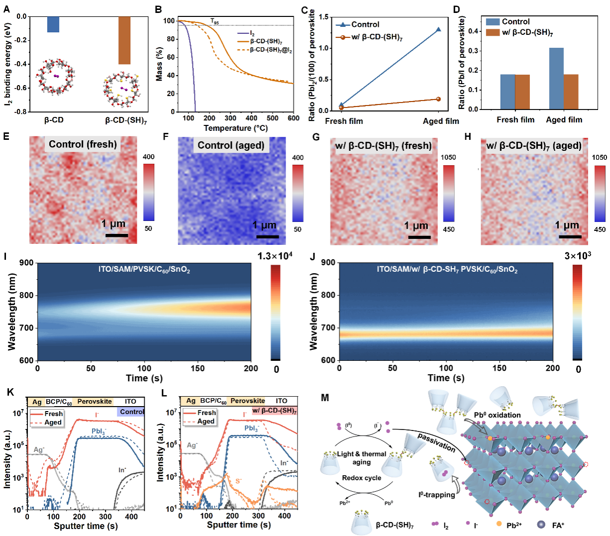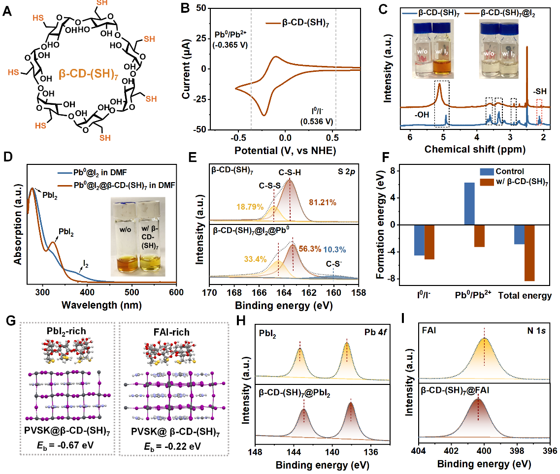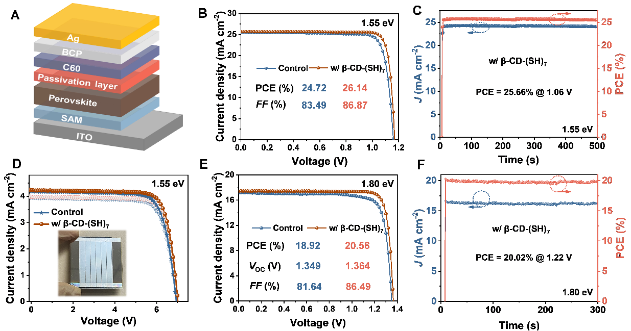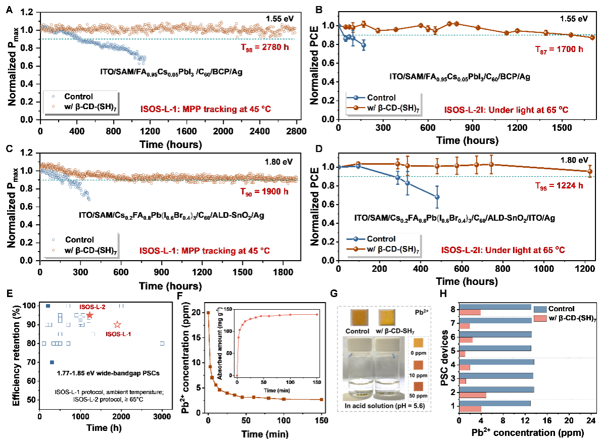 针对上述科学问题,付强博士和Alex K.-Y. Jen教授团队提出一种基于超分子体系的三重作用调控方法。通过在β-环糊精(β-Cyclodextrin, β-CD)分子骨架上接枝七个巯基(-SH)取代基团,成功合成多功能超分子材料β-CD-(SH)7。该材料通过三种协同作用机制实现对PSCs性能的调控:β-CD分子特有的空腔结构可作为分子级陷阱,借助主体-客体相互作用实现对I2的选择性捕获,有效抑制碘物种的逸出;-SH基团可参与氧化还原反应,通过可逆的S-S键形成过程将I2还原为I-,同时将Pb0氧化为Pb2+,既阻断碘损失路径,又实现Pb2+的再生以修复钙钛矿晶格缺陷;此外,β-CD-(SH)7可与钙钛矿中未配位的Pb2+及卤素空位形成强相互作用,显著抑制离子迁移行为,其优异的铅螯合能力还可降低Pb泄漏风险,兼顾环境可持续性。将β-CD-(SH)7作为添加剂引入不同组分的PSCs体系后,在窄带隙(1.55 eV)倒置结构PSCs中,实现了26.14%的高效率;在宽带隙器件中(1.68 eV与1.80 eV),PCE分别达到22.60%与20.56%;活性面积为11.0 cm2的小型组件的PCE为23.48%。1.55-eV PSCs在45°C下进行最大功率点跟踪测试时,T98寿命超过2780小时(ISOS-L-1I),在65°C连续光照条件下(ISOS-L-2I),1700小时后仍保持初始PCE的87%以上;而1.80eV宽带隙PSCs在45°C连续光照下(ISOS-L-1I),T90寿命超过1900小时,在65°C连续光照条件下(ISOS-L-2I),T95寿命达到1224小时以上。