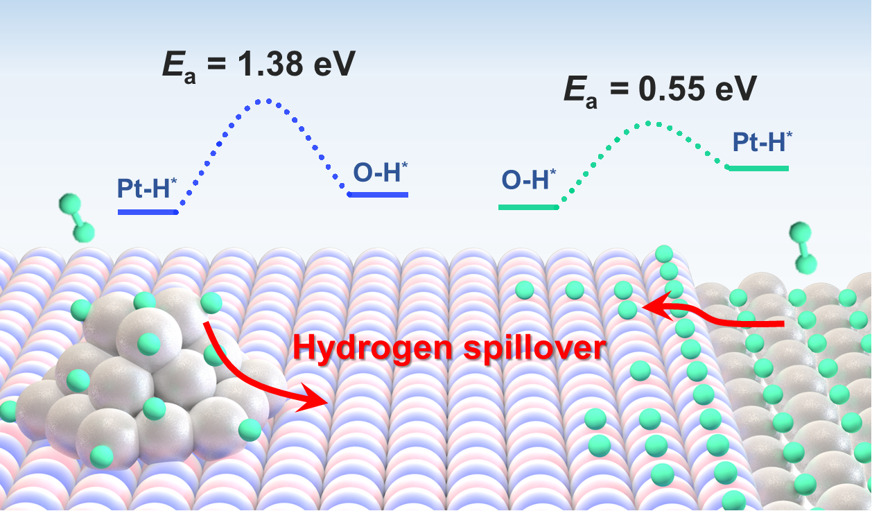 氢活化和氢溢流是众多加氢反应的重要基元过程,对其有效调控是提高加氢催化反应性能的关键。此前,该团队通过构建氧化物表界面活性中心,调控氢气活化方式,并利用氢溢流形成的表面氢物种,提升加氢反应性能,继而通过氢溢流再生“M-O路易斯酸碱对”活性中心,实现水分子(H2O)有效活化。